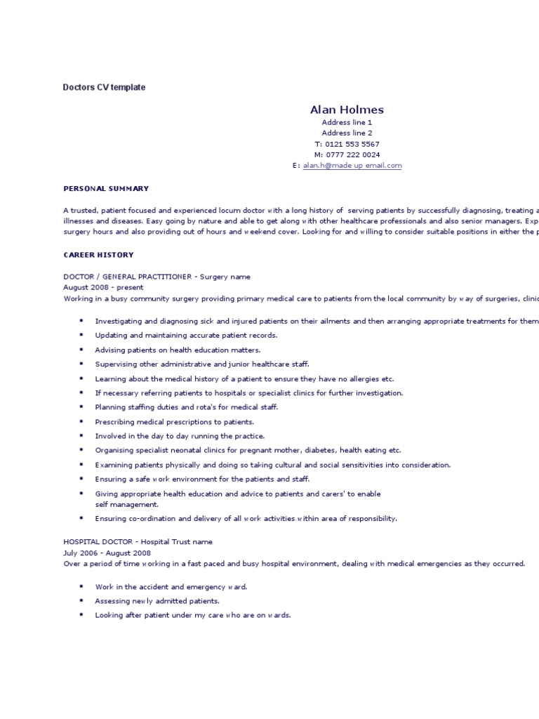 Close attention to detail is required in your resume, as this is expected in this challenging area of work. Career summary a trusted, patient focused and experienced locum doctor with a long history of serving patients by successfully diagnosing, treating and also managing their illnesses and diseases having rich experience of 3+ years as a surgeon. Subscribe to our job portal and get a chance to download the doctor resume sample pdf docs that help you to build a resume of your own that best showcases you to the recruiter. The clearest structure for medical resumes is demonstrated in this sample medical resume, which may be applied to any medical field or profession. Md physician doctor resume you are getting a detailed and very organized doctor resume which covers all the major points of a standard cv such as education, work experience, license, certification, accreditation, research experience and also awards. Include details of your residency training if space allows. Here you will come across resume examples for each type of doctor. An effective physician's résumé should balance simplicity, information, and elegance. Coordinate physician schedules and maintain patient. What help can we offer. The structure isn't as importance as the contents — i.e., what elements should be included or left out. Emphasize your most relevant and impressive experiences. This is a good reference sample for any doctor or higher level medical professional or doctor's that have a background in health care research.this resume for a doctor of medicine uses a medical consultant jo